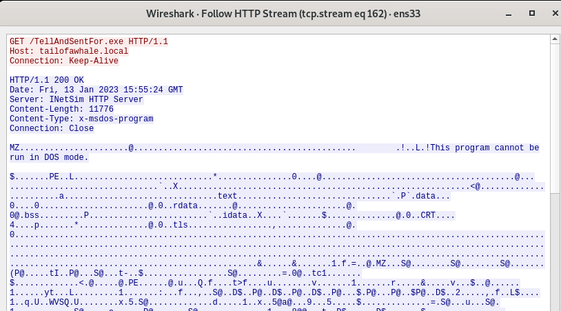 So if we have INetSim running and trying to get a packet capture going we will see that the url is gets a 200 ok, it will stop executing the malware.