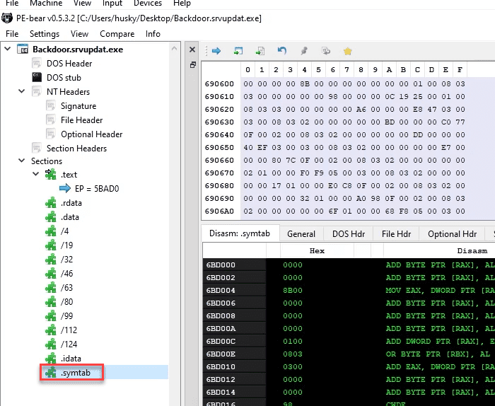 .symtab showed up when loading the sample into PEbear