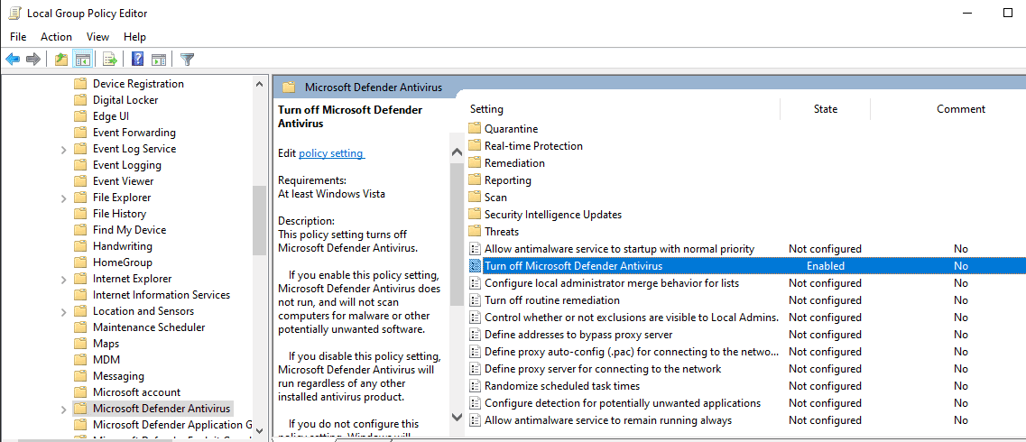 In GPO, navigate to → Administrative Templates → Windows Components - → Microsoft Defender Antivirus → Enable “Turn off Microsoft Defender - Antivirus”