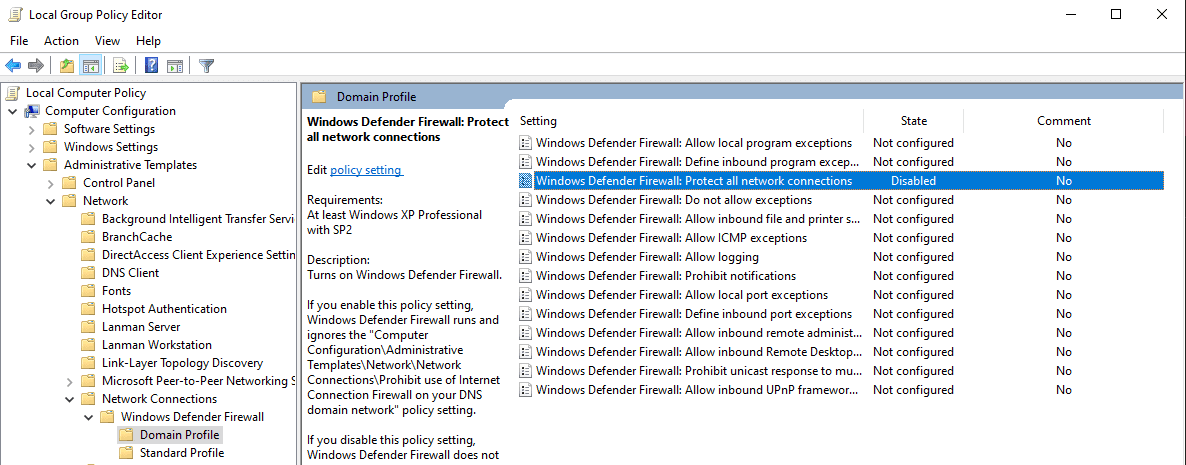 GPO → Administrative Templates → Network → Network Connections → - Windows Defender Firewall → Domain Profile → Disable ``Protect All - Network Connections```