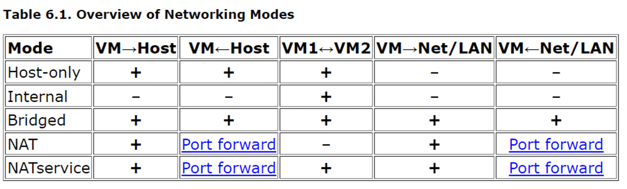 Consider the following table of VirtualBox network configurations: