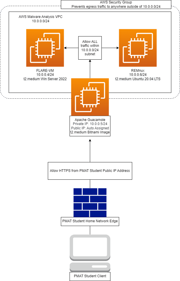 Safety is taught from the beginning of this course and underpins every single activity that we conduct. One of the most critical pieces of the malware analysis puzzle is the lab setup. Isolating a malware analysis lab is incredibly important to reduce the risk to your physical host and surrounding network.