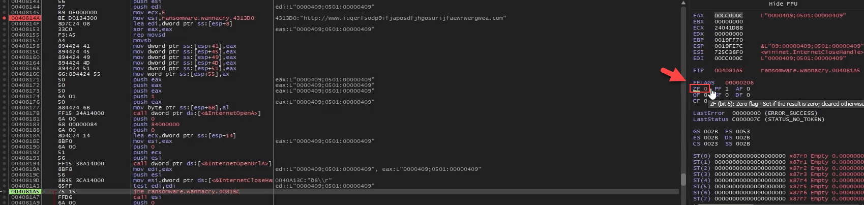 So the test result reflected in ZF is 0, which means the flag was cleared due to API call InternetOpenUrl returning a result